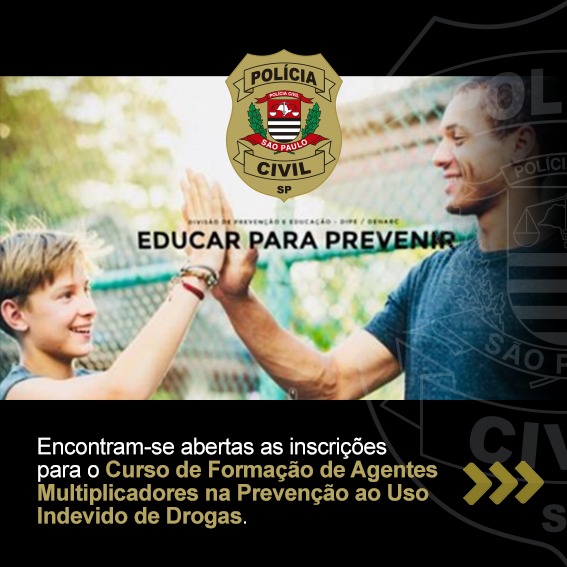Estão abertas as inscrições para a nova edição do "Curso de Formação de Agentes Multiplicadores na Prevenção ao Uso de Drogas". O curso será realizado no Auditório DENARC, localizado na Rua Rodolfo Miranda nº 636, no bairro Bom Retiro, em São Paulo.